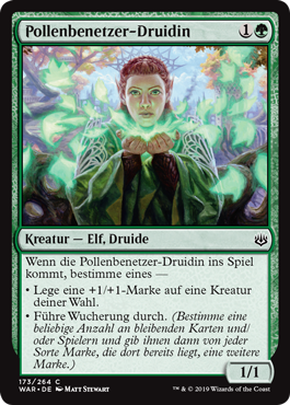 | Rules | When Pollenbright Druid enters the battlefield, choose one — • Put a +1/+1 counter on target creature. • Proliferate. (Choose any number of permanents and/or players, then give each another counter of each kind already there.) |