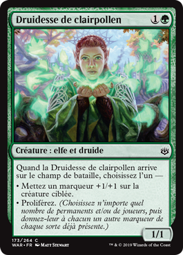 | Rules | When Pollenbright Druid enters the battlefield, choose one — • Put a +1/+1 counter on target creature. • Proliferate. (Choose any number of permanents and/or players, then give each another counter of each kind already there.) |
