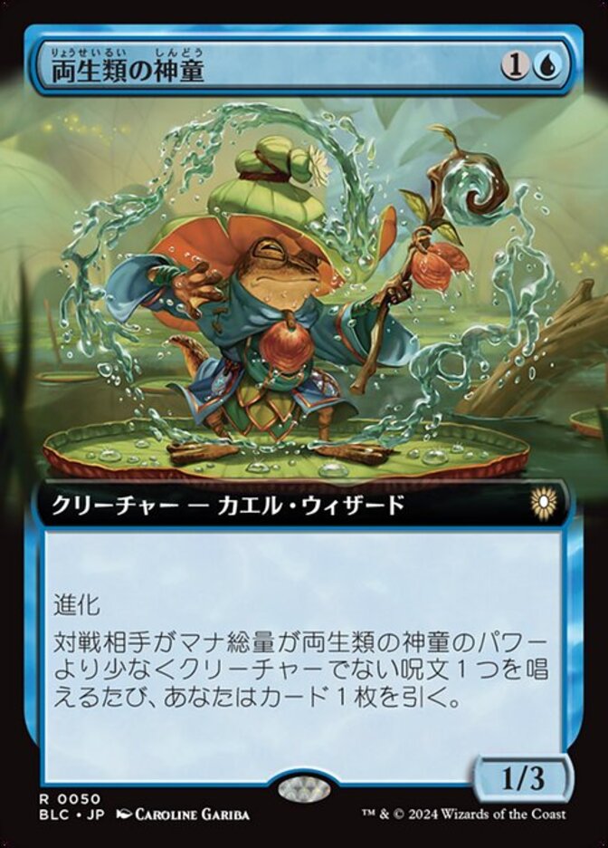 | Rules | Evolve (Whenever a creature you control enters, if that creature has greater power or toughness than this creature, put a +1/+1 counter on this creature.) Whenever an opponent casts a noncreature spell with mana value less than Pollywog Prodigy's power, draw a card. |