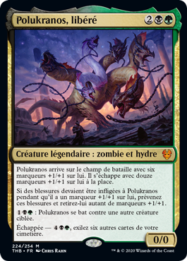 | Rules | Polukranos enters the battlefield with six +1/+1 counters on it. It escapes with twelve +1/+1 counters on it instead. If damage would be dealt to Polukranos while it has a +1/+1 counter on it, prevent that damage and remove that many +1/+1 counters from it. : Polukranos fights another target creature. Escape—, Exile six other cards from your graveyard. |
