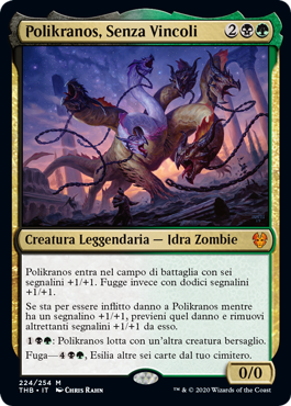 | Rules | Polukranos enters the battlefield with six +1/+1 counters on it. It escapes with twelve +1/+1 counters on it instead. If damage would be dealt to Polukranos while it has a +1/+1 counter on it, prevent that damage and remove that many +1/+1 counters from it. : Polukranos fights another target creature. Escape—, Exile six other cards from your graveyard. |