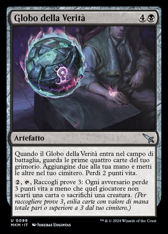 | Rules | When Polygraph Orb enters the battlefield, look at the top four cards of your library. Put two of them into your hand and the rest into your graveyard. You lose 2 life. , , Collect evidence 3: Each opponent loses 3 life unless they discard a card or sacrifice a creature. (To collect evidence 3, exile cards with total mana value 3 or greater from your graveyard.) |