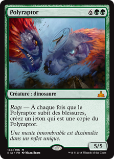 | Rules | Enrage — Whenever Polyraptor is dealt damage, create a token that's a copy of Polyraptor. |