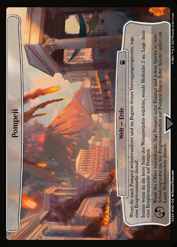 | Rules | When you planeswalk to Pompeii and at the beginning of your upkeep, put an eruption counter on it. Whenever you roll a blank on the planar die, scry 2. Then put an eruption counter on Pompeii. When chaos ensues, Pompeii deals damage to each creature and each player equal to the number of eruption counters on Pompeii. Each player sacrifices a land. Then planeswalk. |