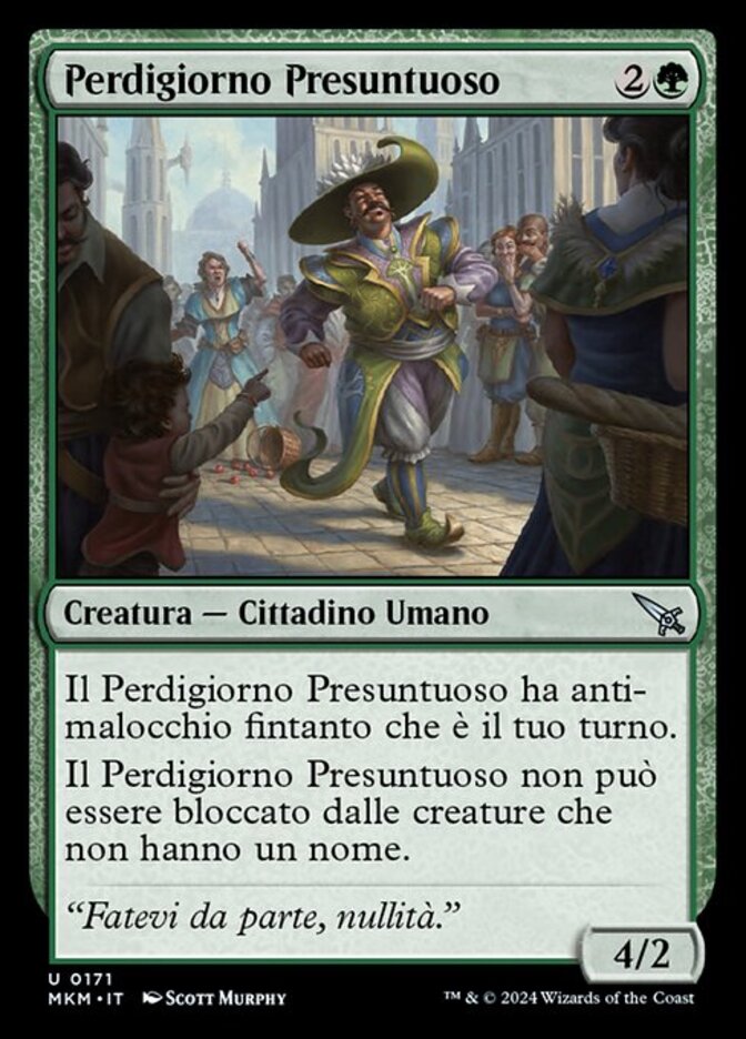 | Rules | Pompous Gadabout has hexproof as long as it's your turn. Pompous Gadabout can't be blocked by creatures that don't have a name. |