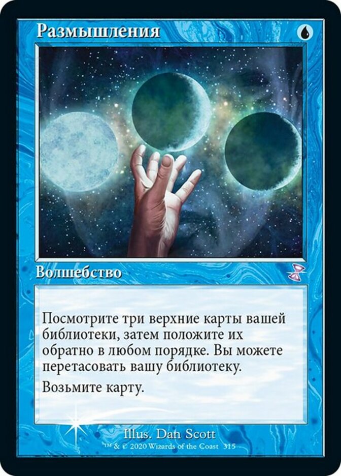 | Rules | Look at the top three cards of your library, then put them back in any order. You may shuffle. Draw a card. |