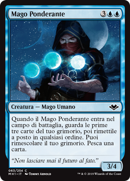 | Rules | When Pondering Mage enters the battlefield, look at the top three cards of your library, then put them back in any order. You may shuffle. Draw a card. |