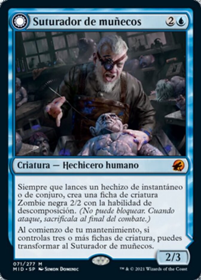 | Rules | Whenever you cast an instant or sorcery spell, create a 2/2 black Zombie creature token with decayed. (It can't block. When it attacks, sacrifice it at end of combat.) At the beginning of your upkeep, if you control three or more creature tokens, you may transform Poppet Stitcher. // Creature tokens you control lose all abilities and have base power and toughness 3/3. At the beginning of your upkeep, you may transform Poppet Factory. |