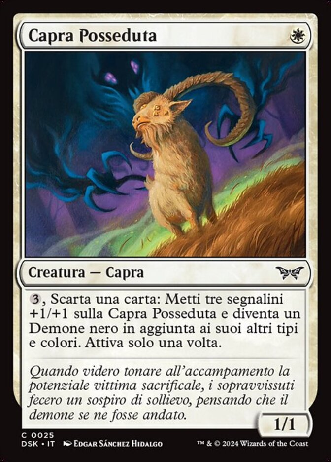 | Rules | , Discard a card: Put three +1/+1 counters on Possessed Goat and it becomes a black Demon in addition to its other colors and types. Activate only once. |
