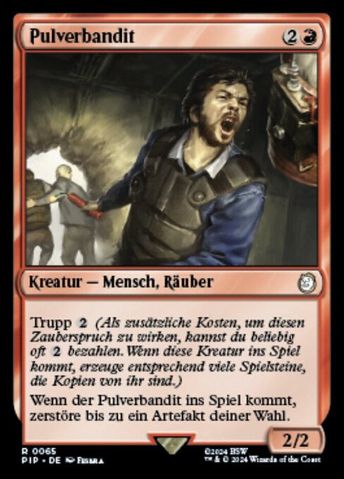 | Rules | Squad (As an additional cost to cast this spell, you may pay any number of times. When this creature enters the battlefield, create that many tokens that are copies of it.) When Powder Ganger enters the battlefield, destroy up to one target artifact. |