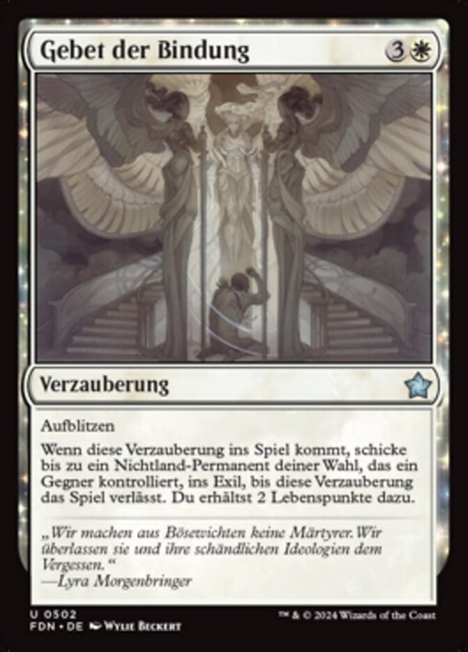| Rules | Flash When Prayer of Binding enters the battlefield, exile up to one target nonland permanent an opponent controls until Prayer of Binding leaves the battlefield. You gain 2 life. |