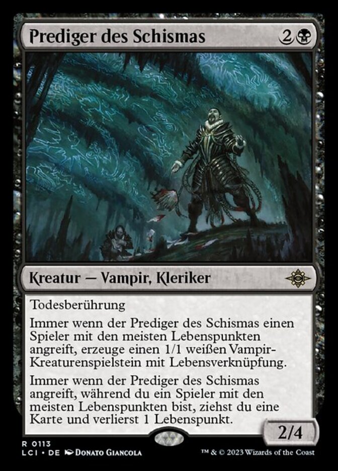 | Rules | Deathtouch Whenever Preacher of the Schism attacks the player with the most life or tied for most life, create a 1/1 white Vampire creature token with lifelink. Whenever Preacher of the Schism attacks while you have the most life or are tied for most life, you draw a card and you lose 1 life. |
