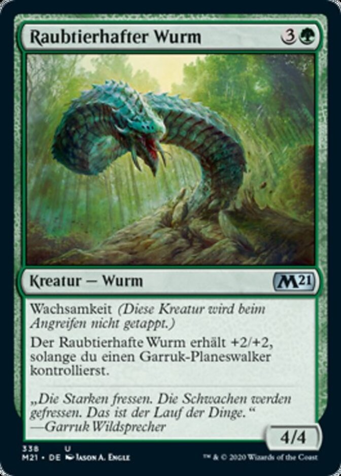 | Rules | Vigilance (Attacking doesn't cause this creature to tap.) Predatory Wurm gets +2/+2 as long as you control a Garruk planeswalker. |