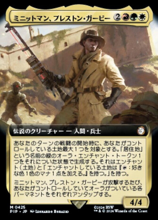 | Rules | At the beginning of combat on your turn, create a green Aura enchantment token named Settlement attached to up to one target land you control. It has enchant land and "Enchanted land has ': Add one mana of any color.'" Whenever Preston Garvey, Minuteman attacks, untap each enchanted permanent you control. |