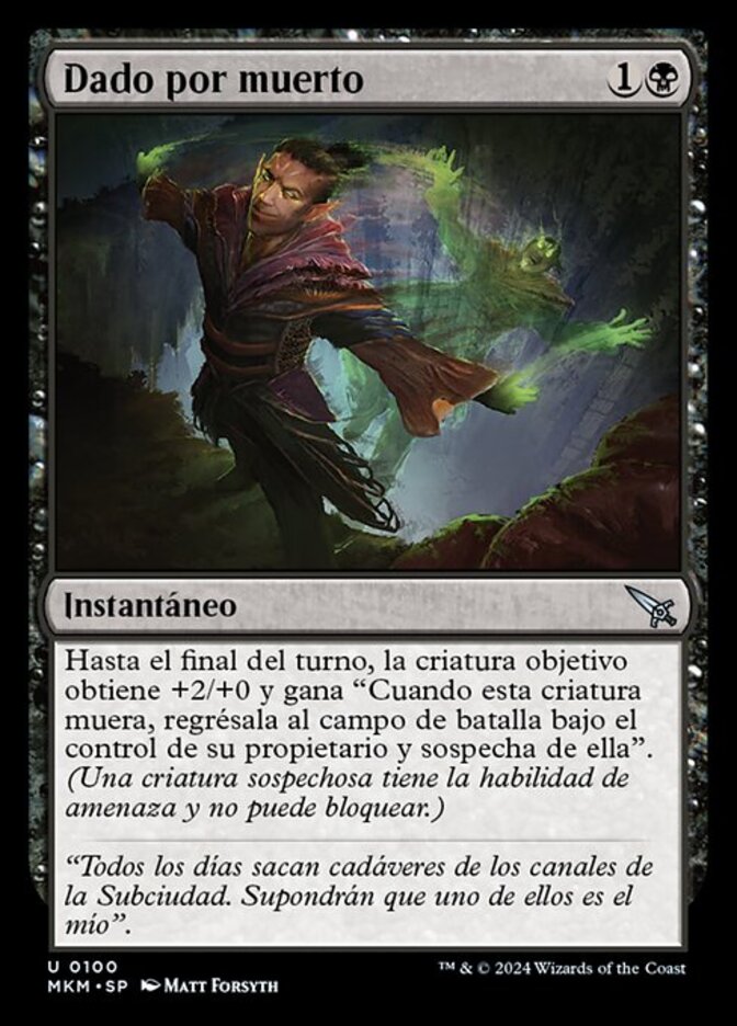| Rules | Until end of turn, target creature gets +2/+0 and gains "When this creature dies, return it to the battlefield under its owner's control and suspect it." (A suspected creature has menace and can't block.) |