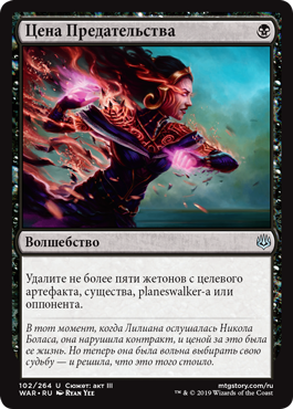 | Flavor | The moment Liliana defied Nicol Bolas, her contract was broken, and her life was forfeit. But she was free to choose her fate, and she decided it was worth the price. |