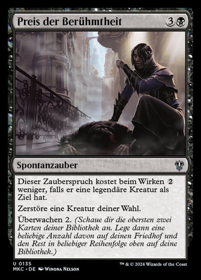 | Rules | This spell costs less to cast if it targets a legendary creature. Destroy target creature. Surveil 2. (Look at the top two cards of your library, then put any number of them into your graveyard and the rest on top of your library in any order.) |
