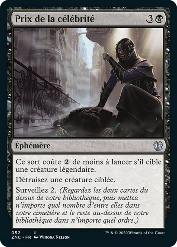 | Rules | This spell costs less to cast if it targets a legendary creature. Destroy target creature. Surveil 2. (Look at the top two cards of your library, then put any number of them into your graveyard and the rest on top of your library in any order.) |