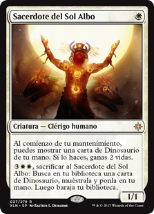 | Rules | At the beginning of your upkeep, you may reveal a Dinosaur card from your hand. If you do, you gain 2 life. , Sacrifice Priest of the Wakening Sun: Search your library for a Dinosaur card, reveal it, put it into your hand, then shuffle. |