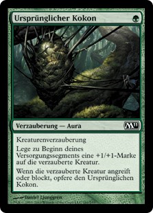 | Rules | Enchant creature At the beginning of your upkeep, put a +1/+1 counter on enchanted creature. When enchanted creature attacks or blocks, sacrifice Primal Cocoon. |