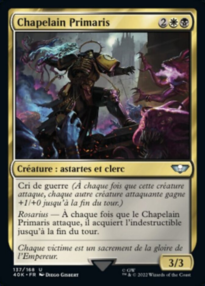 | Rules | Battle cry (Whenever this creature attacks, each other attacking creature gets +1/+0 until end of turn.) Rosarius — Whenever Primaris Chaplain attacks, it gains indestructible until end of turn. |