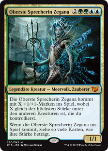 | Rules | Prime Speaker Zegana enters the battlefield with X +1/+1 counters on it, where X is the greatest power among other creatures you control. When Prime Speaker Zegana enters the battlefield, draw cards equal to its power. |