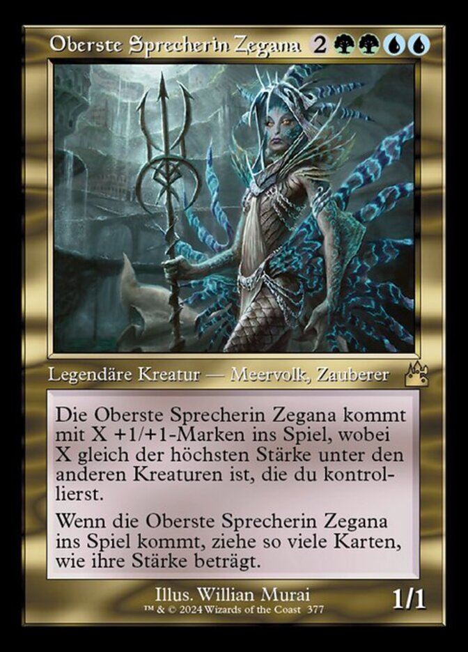 | Rules | Prime Speaker Zegana enters the battlefield with X +1/+1 counters on it, where X is the greatest power among other creatures you control. When Prime Speaker Zegana enters the battlefield, draw cards equal to its power. |
