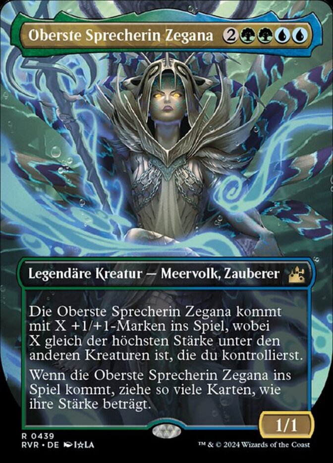 | Rules | Prime Speaker Zegana enters the battlefield with X +1/+1 counters on it, where X is the greatest power among other creatures you control. When Prime Speaker Zegana enters the battlefield, draw cards equal to its power. |