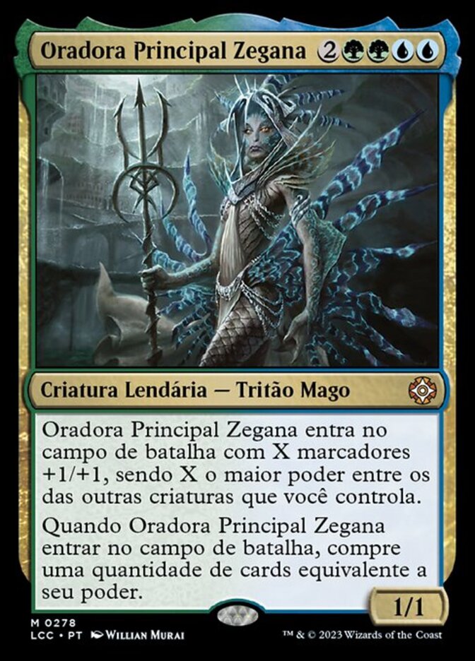 | Rules | Prime Speaker Zegana enters the battlefield with X +1/+1 counters on it, where X is the greatest power among other creatures you control. When Prime Speaker Zegana enters the battlefield, draw cards equal to its power. |