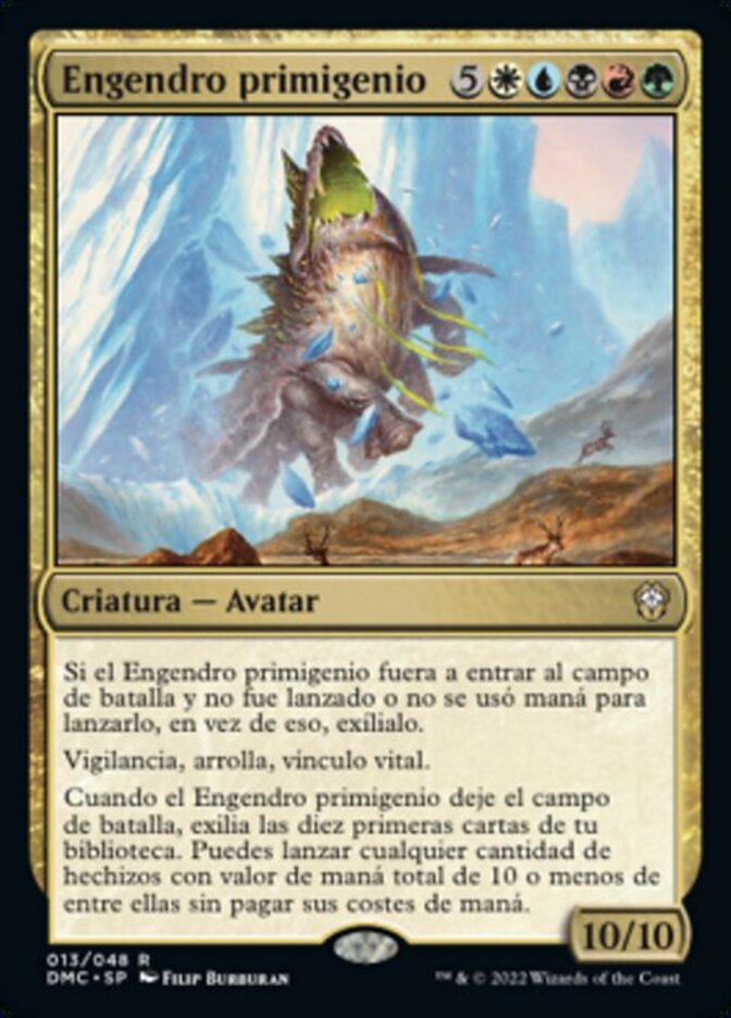 | Rules | If Primeval Spawn would enter the battlefield and it wasn't cast or no mana was spent to cast it, exile it instead. Vigilance, trample, lifelink When Primeval Spawn leaves the battlefield, exile the top ten cards of your library. You may cast any number of spells with total mana value 10 or less from among them without paying their mana costs. |