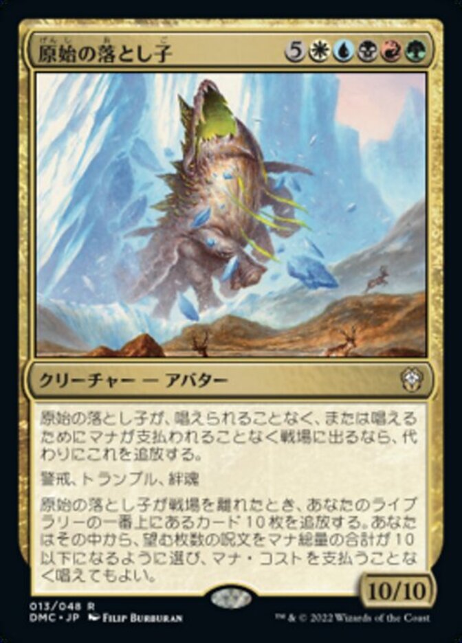 | Rules | If Primeval Spawn would enter the battlefield and it wasn't cast or no mana was spent to cast it, exile it instead. Vigilance, trample, lifelink When Primeval Spawn leaves the battlefield, exile the top ten cards of your library. You may cast any number of spells with total mana value 10 or less from among them without paying their mana costs. |