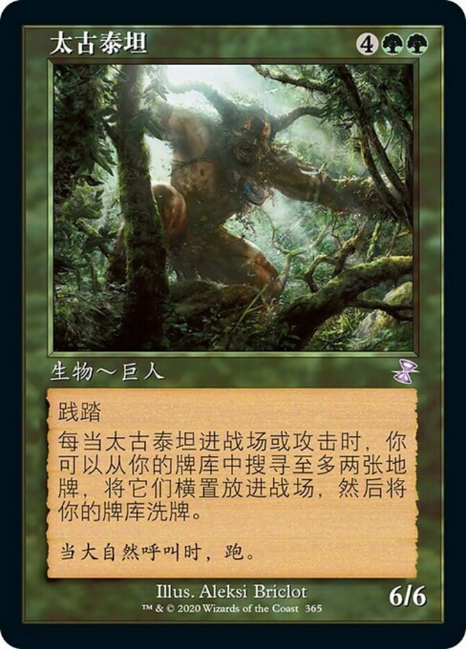 | Rules | Trample Whenever Primeval Titan enters the battlefield or attacks, you may search your library for up to two land cards, put them onto the battlefield tapped, then shuffle. |