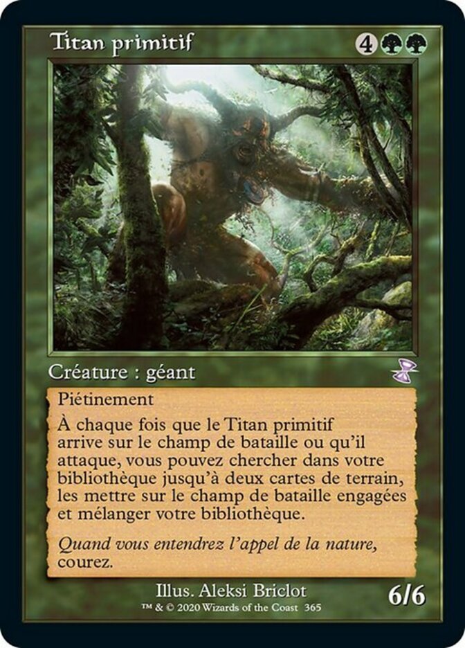 | Rules | Trample Whenever Primeval Titan enters the battlefield or attacks, you may search your library for up to two land cards, put them onto the battlefield tapped, then shuffle. |