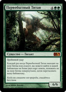 | Rules | Trample Whenever Primeval Titan enters the battlefield or attacks, you may search your library for up to two land cards, put them onto the battlefield tapped, then shuffle. |