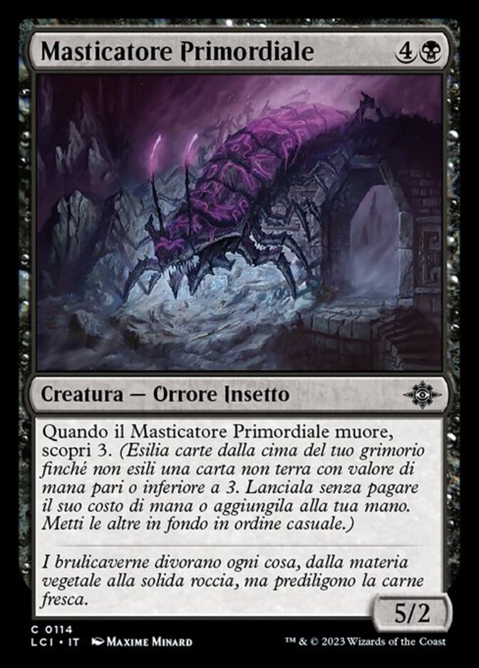 | Rules | When Primordial Gnawer dies, discover 3. (Exile cards from the top of your library until you exile a nonland card with mana value 3 or less. Cast it without paying its mana cost or put it into your hand. Put the rest on the bottom in a random order.) |