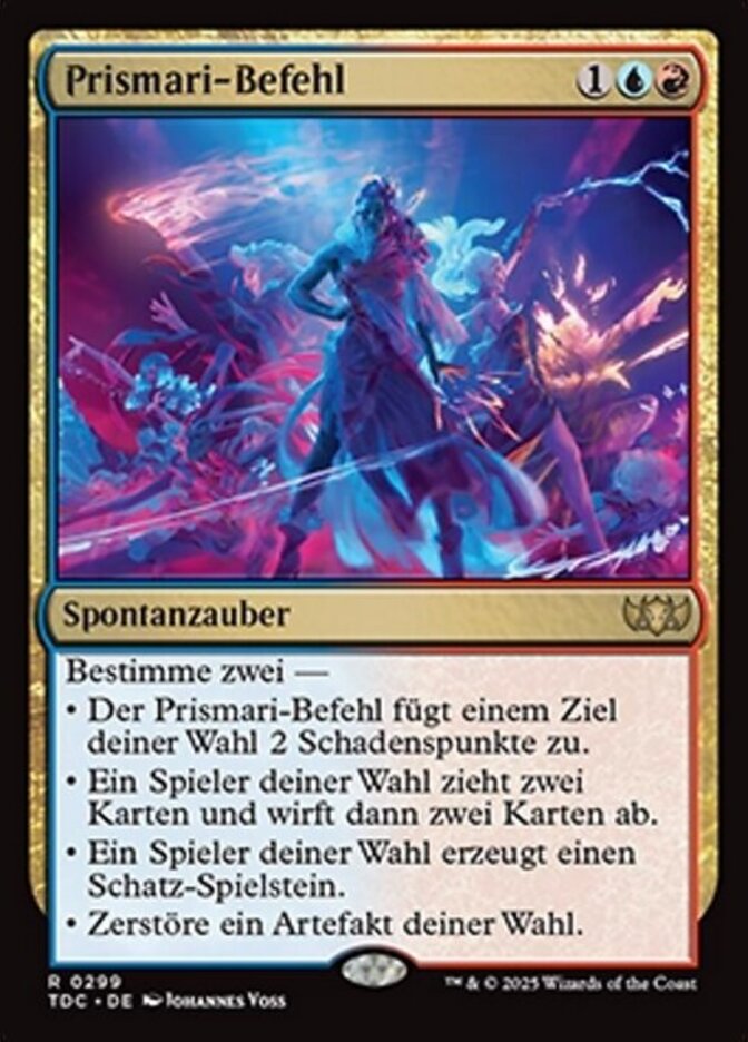 | Rules | Choose two — • Prismari Command deals 2 damage to any target. • Target player draws two cards, then discards two cards. • Target player creates a Treasure token. • Destroy target artifact. |