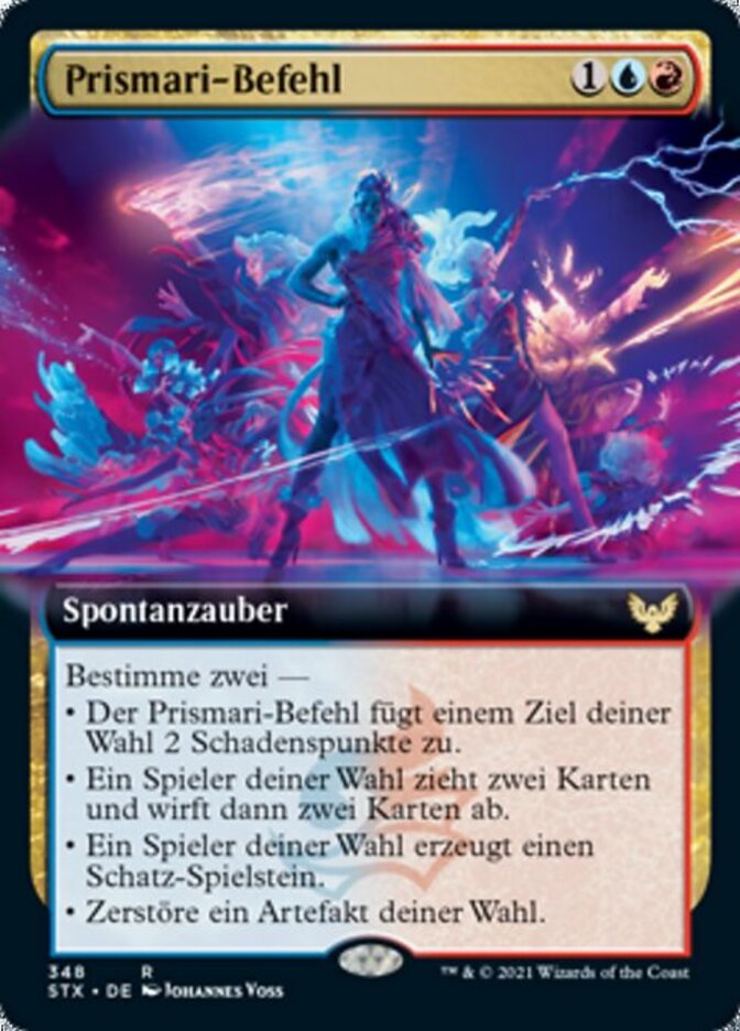 | Rules | Choose two — • Prismari Command deals 2 damage to any target. • Target player draws two cards, then discards two cards. • Target player creates a Treasure token. • Destroy target artifact. |