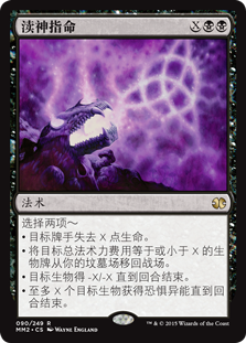 | Rules | Choose two — • Target player loses X life. • Return target creature card with mana value X or less from your graveyard to the battlefield. • Target creature gets -X/-X until end of turn. • Up to X target creatures gain fear until end of turn. (They can't be blocked except by artifact creatures and/or black creatures.) |