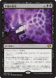 | Rules | Choose two — • Target player loses X life. • Return target creature card with mana value X or less from your graveyard to the battlefield. • Target creature gets -X/-X until end of turn. • Up to X target creatures gain fear until end of turn. (They can't be blocked except by artifact creatures and/or black creatures.) |