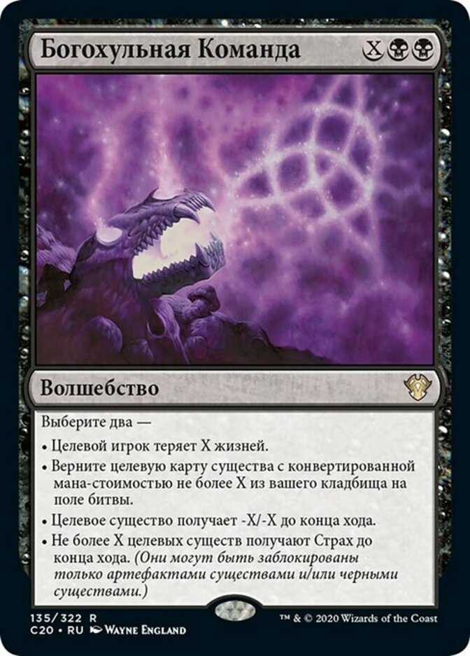 | Rules | Choose two — • Target player loses X life. • Return target creature card with mana value X or less from your graveyard to the battlefield. • Target creature gets -X/-X until end of turn. • Up to X target creatures gain fear until end of turn. (They can't be blocked except by artifact creatures and/or black creatures.) |