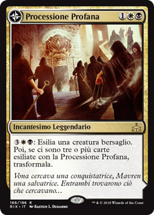 | Rules | : Exile target creature. Then if there are three or more cards exiled with Profane Procession, transform it. // (Transforms from Profane Procession.) : Add one mana of any color. , : Put a creature card exiled with this permanent onto the battlefield under your control. |