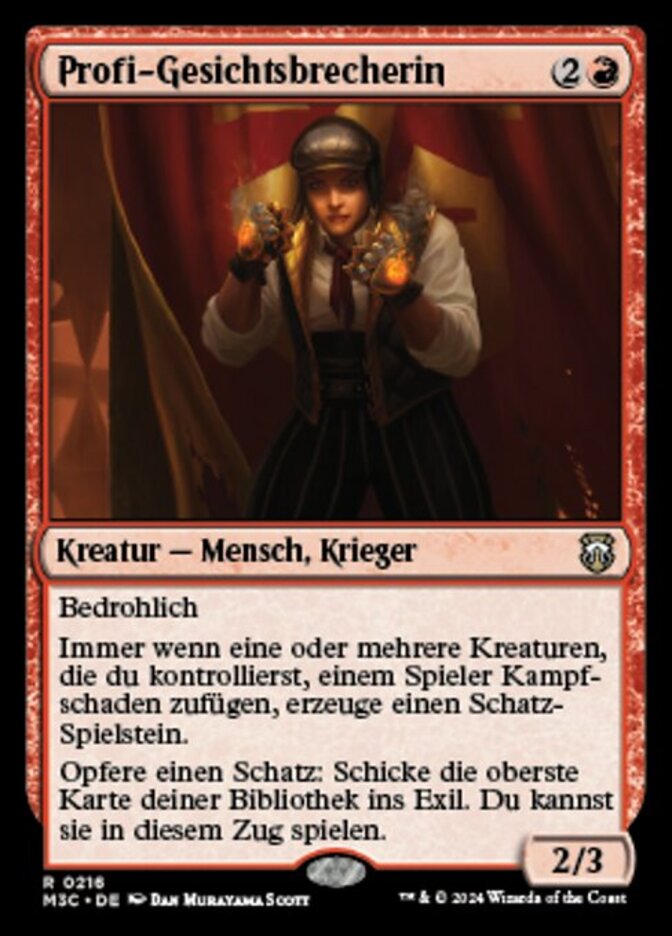 | Rules | Menace Whenever one or more creatures you control deal combat damage to a player, create a Treasure token. Sacrifice a Treasure: Exile the top card of your library. You may play that card this turn. |