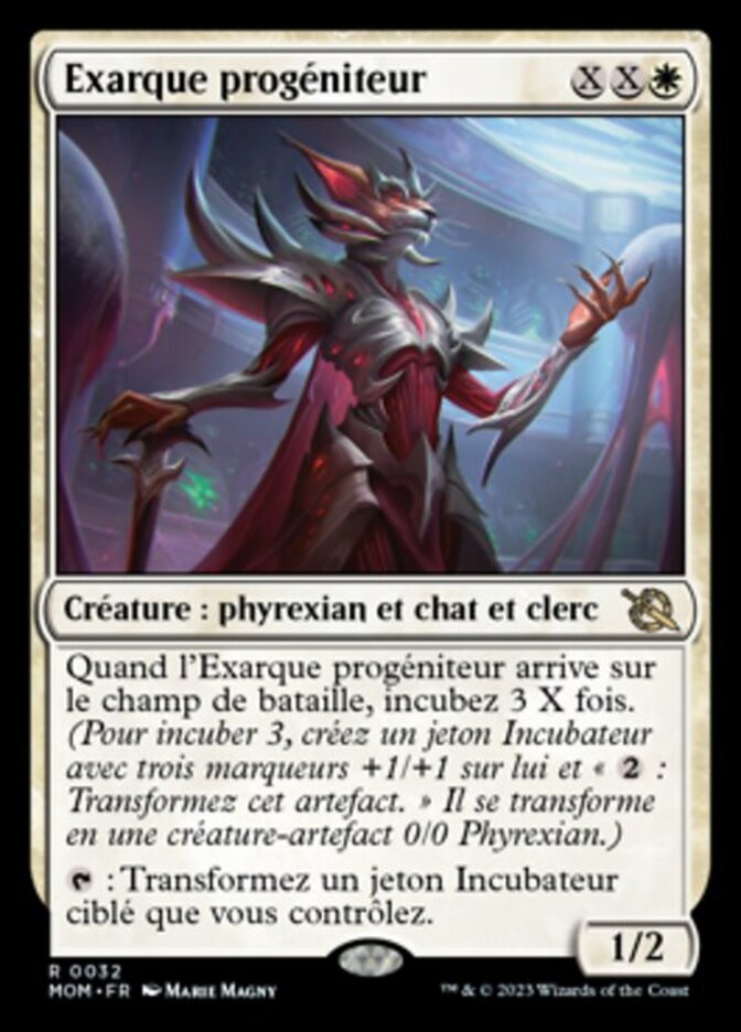 | Rules | When Progenitor Exarch enters the battlefield, incubate 3 X times. (To incubate 3, create an Incubator token with three +1/+1 counters on it and : Transform this artifact." It transforms into a 0/0 Phyrexian artifact creature.) : Transform target Incubator token you control. |