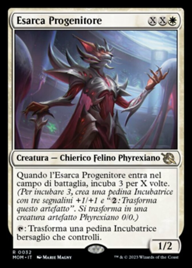 | Rules | When Progenitor Exarch enters the battlefield, incubate 3 X times. (To incubate 3, create an Incubator token with three +1/+1 counters on it and : Transform this artifact." It transforms into a 0/0 Phyrexian artifact creature.) : Transform target Incubator token you control. |