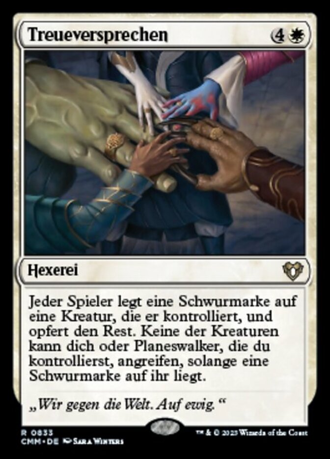 | Rules | Each player puts a vow counter on a creature they control and sacrifices the rest. Each of those creatures can't attack you or planeswalkers you control for as long as it has a vow counter on it. |