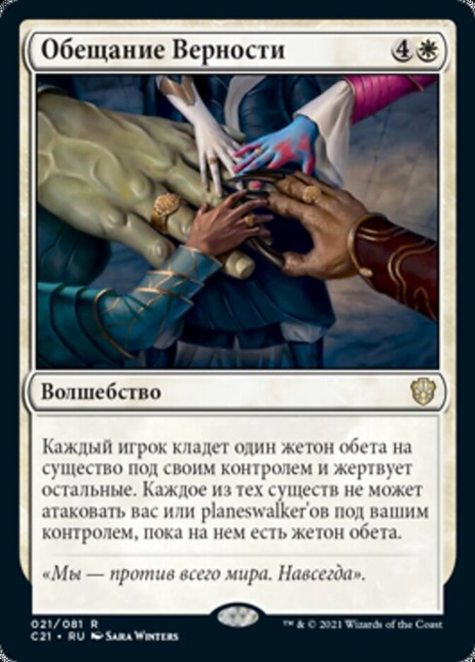 | Rules | Each player puts a vow counter on a creature they control and sacrifices the rest. Each of those creatures can't attack you or planeswalkers you control for as long as it has a vow counter on it. |