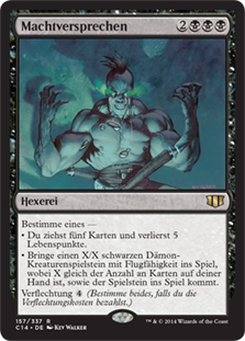 | Rules | Choose one — • You draw five cards and you lose 5 life. • Create an X/X black Demon creature token with flying, where X is the number of cards in your hand. Entwine (Choose both if you pay the entwine cost.) |