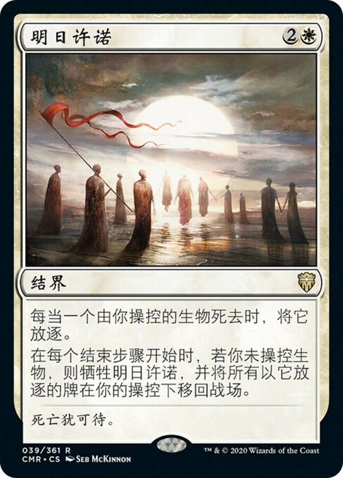 | Rules | Whenever a creature you control dies, exile it. At the beginning of each end step, if you control no creatures, sacrifice Promise of Tomorrow and return all cards exiled with it to the battlefield under your control. |