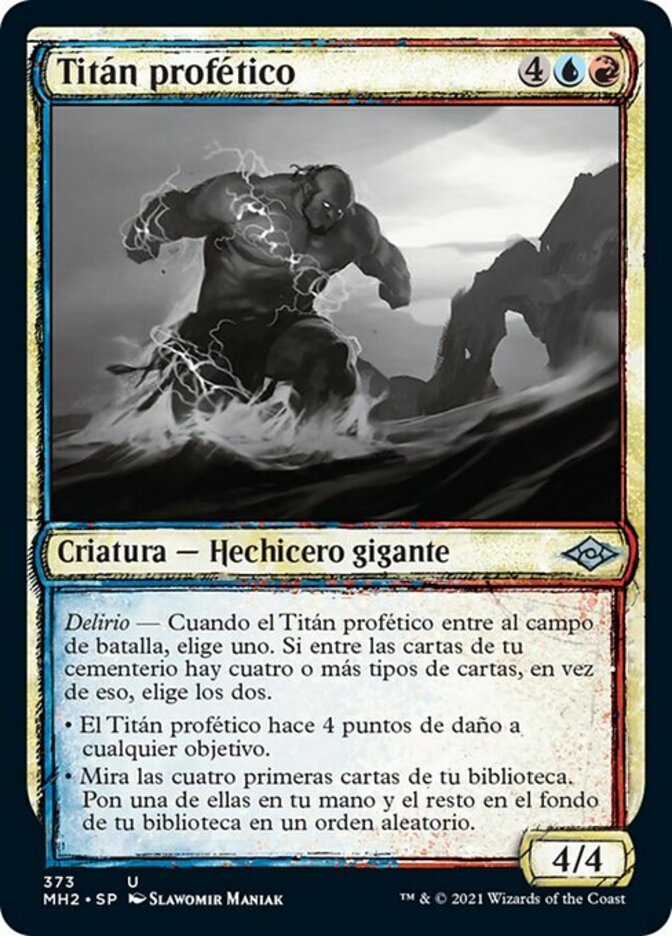 | Rules | Delirium — When Prophetic Titan enters the battlefield, choose one. If there are four or more card types among cards in your graveyard, choose both instead. • Prophetic Titan deals 4 damage to any target. • Look at the top four cards of your library. Put one of them into your hand and the rest on the bottom of your library in a random order. |