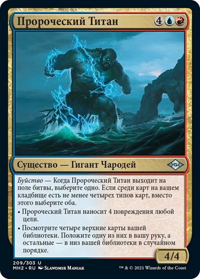 | Rules | Delirium — When Prophetic Titan enters the battlefield, choose one. If there are four or more card types among cards in your graveyard, choose both instead. • Prophetic Titan deals 4 damage to any target. • Look at the top four cards of your library. Put one of them into your hand and the rest on the bottom of your library in a random order. |